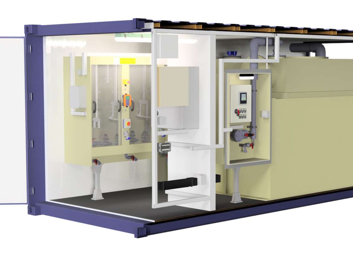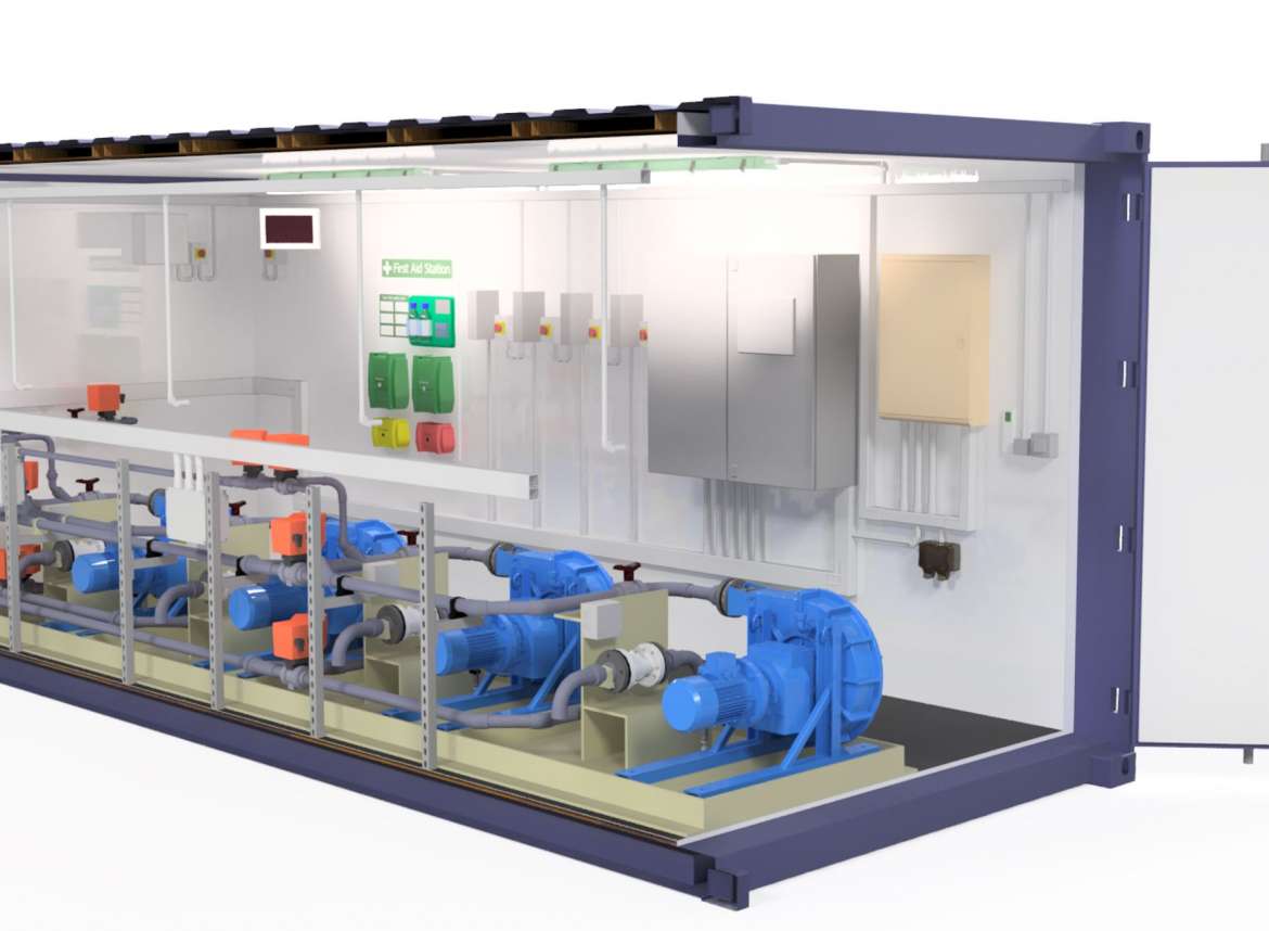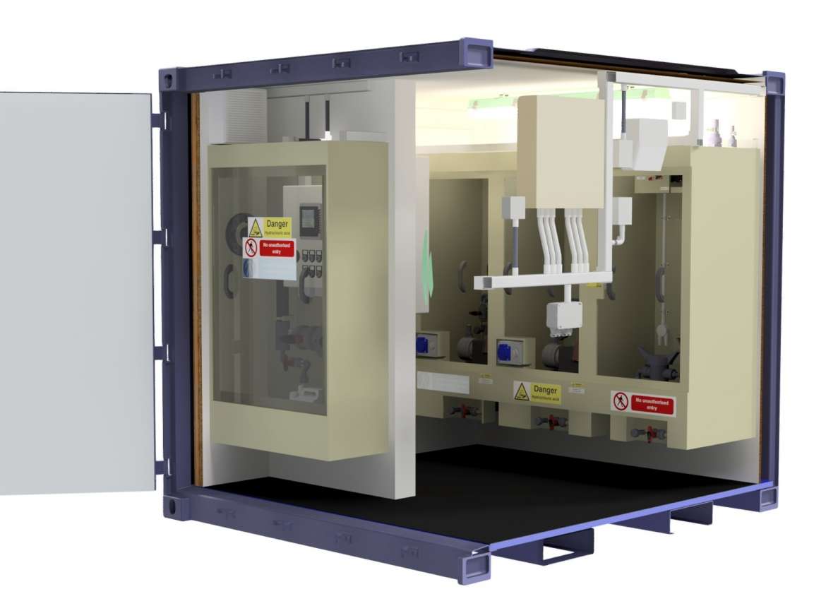 The AquaDose 5K2 – Sodium Bisulphite is supplied with 2 off 2,500L bulk storage tanks, the tanks are located within a 110% HDPE bund all within the container footprint. The storage tank overflows are supplied with level monitored fume traps and the container is supplied with ventilation fans along with a forced extraction fan to ensure the atmosphere is cleared regularly. A traffic light entry system is fitted to enable the clearing of the atmosphere prior to entry. The container is insulated and provided with ambient tubular fin heaters to maintain a high ambient temperature for chemical performance. The container…
